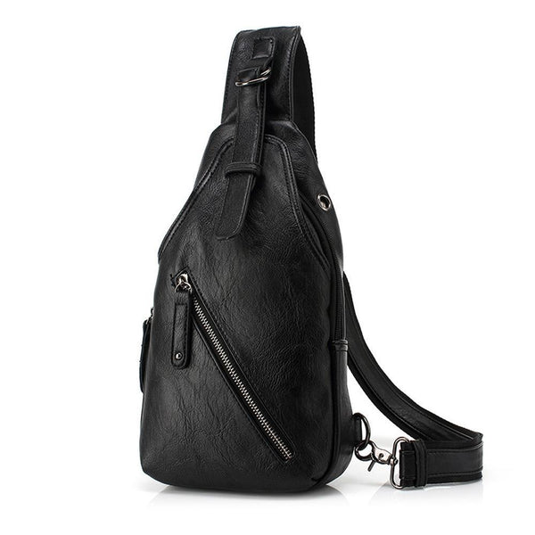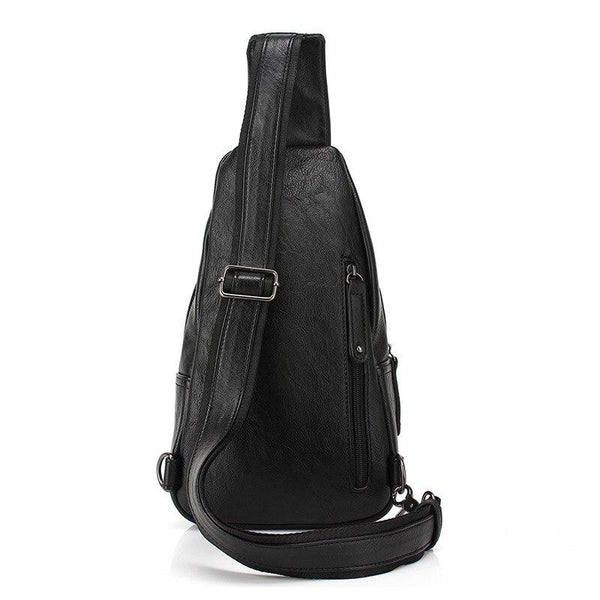 Black faux leather crossbody bag with a zipper main compartment, also secured with a magnetic snap, two outer zipper pockets and several more inner compartments. Comes with adjustable and removable nylon canvas shoulder strap.