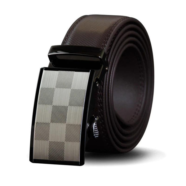 Genuine cowskin leather belt with automatic metal buckle. The belt is 3.5 cm / 1.4 Inch wide and can be modified to waist girth. The rectangular buckle is 8 cm / 3.1 Inch long and 5 cm / 2 Inch is decorated with checkered print.