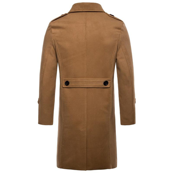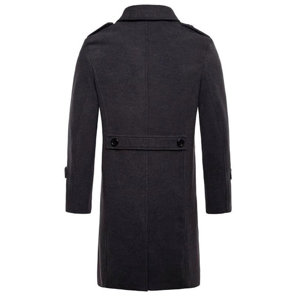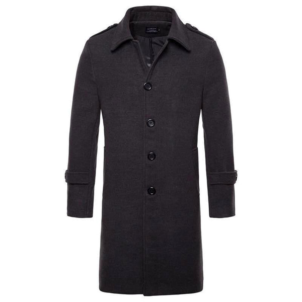 A standard cut woolen coat featuring a single-breasted button closure with traditional turn-down collar. Shoulders and cuffs are decorated with button straps. Has slip side pockets.