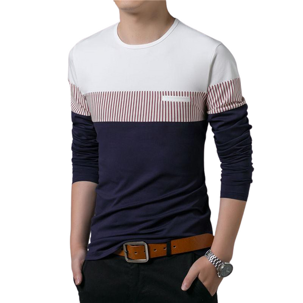 Long-sleeved slim-fit sweatshirt with O-neck. Has wide horizontal stripe on chest and upper sleeves, decorated with thin vertical stripes, with different colors above and below. Has one horizontal chest pocket with no closure and contrasting pocket hem.