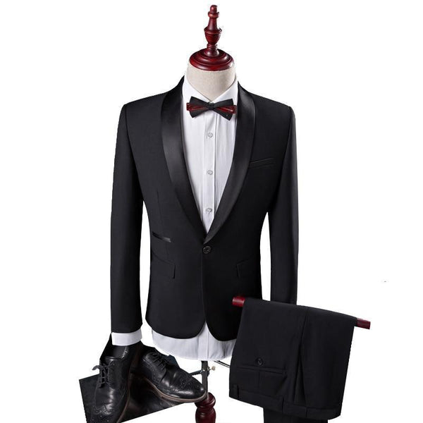 A slim fit two piece suit consisting of a blazer and trousers crafted from quality cotton blend.