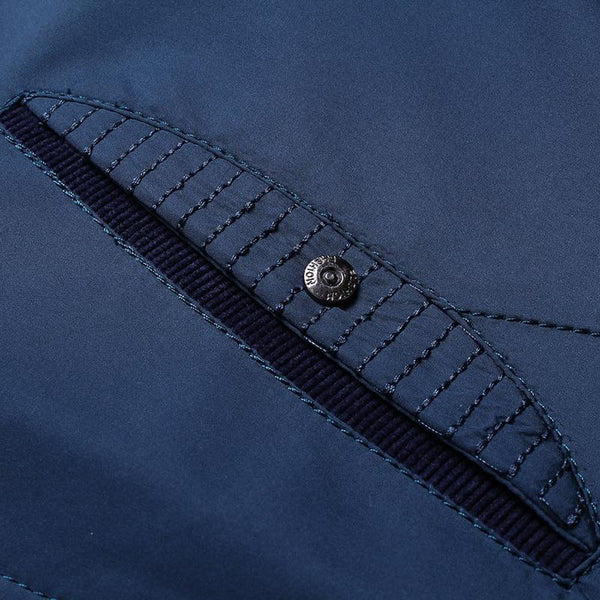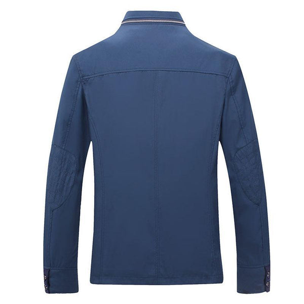 Short spring/autumn jacket with standing collar and zipper&button closure. Has two side pockets and a chest pocket, all with button closure and one inside pocket. Decorated with buttons on cuff and zipper and button on the collar.